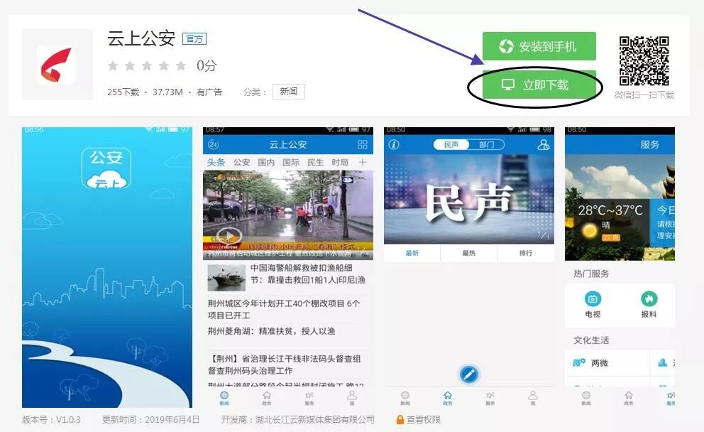 在手机应用市场搜索云上公安手机APP,点击下载安装。