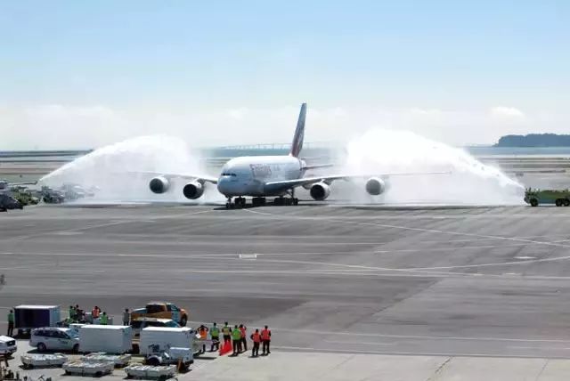 ▲飞机太大而消防车太小。图为全球载客量最高的客机空客A380在美国旧金山机场的过水门。