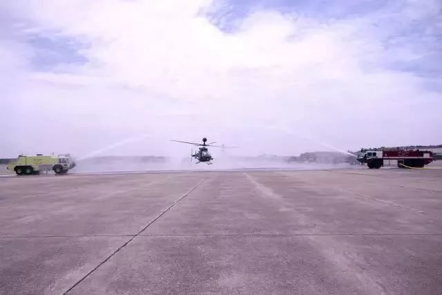 ▲美国贝尔直升机公司生产的OH-58D侦察直升机,首飞于1983 10月6日,2015年5月举行的一次过水门仪式。