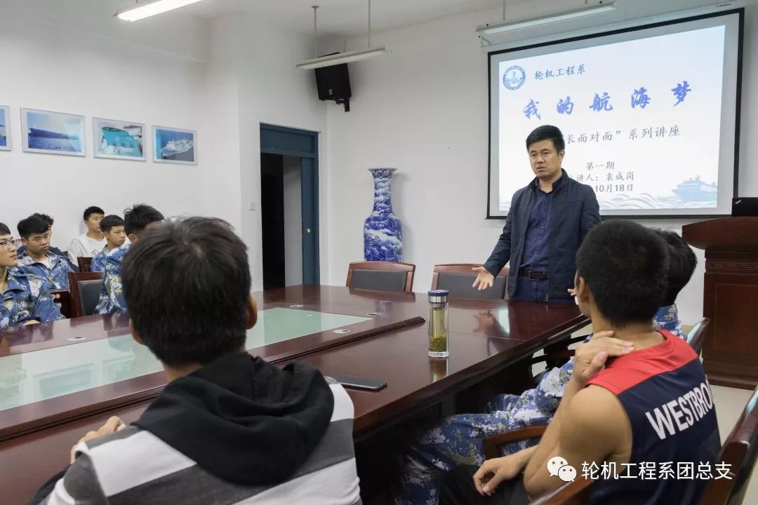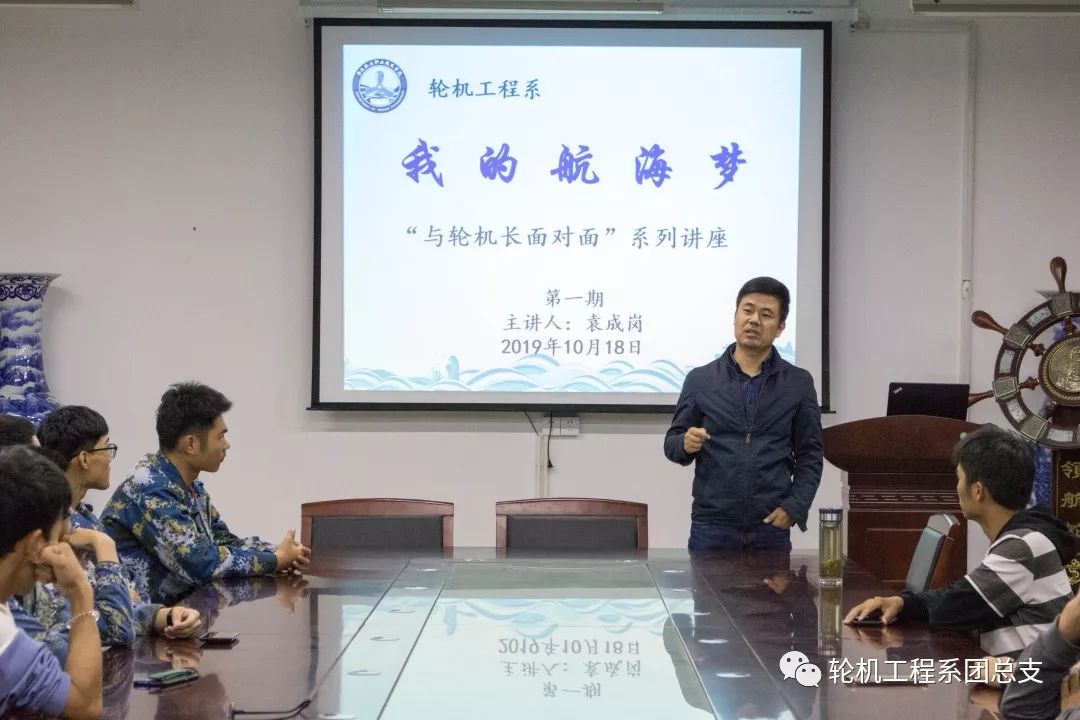 10月18日晚6点轮机工程系于崇海楼中311开展了--我的航海梦“轮机长面对面”系列讲座。轮机长袁成岗抽出宝贵的时间为我们大一学子讲述了自己的工作经历,提高了大家对专业知识的了解,并激励学生加强专业技能,提高身体素质,要心怀航海梦,不断超越自我,砥砺前行。