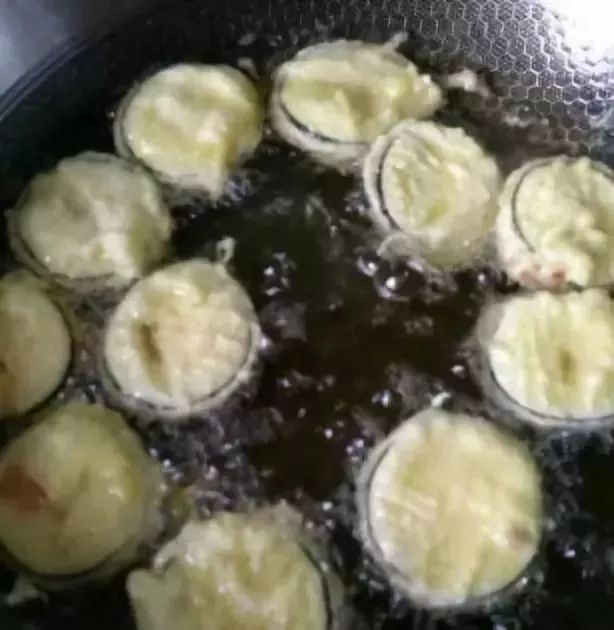 7,炒锅倒入足够的油量,加热后将茄盒一个个夹进去炸至两面金黄