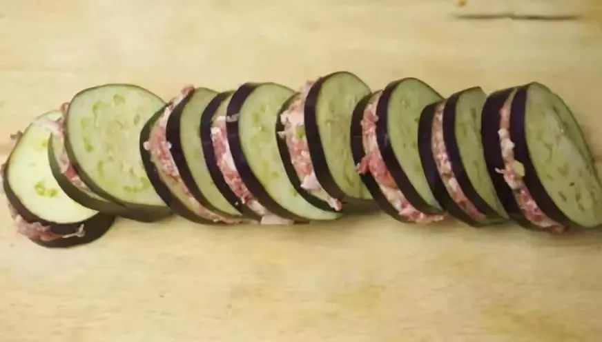4,取一个茄夹,酿入调好味的肉馅,依次酿好茄夹子,摆放好
