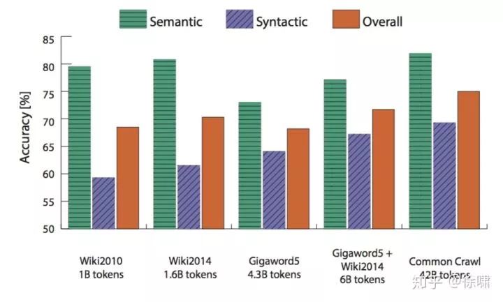 上图为 GloVe 中增加语料库规模对模型准确度的影响。