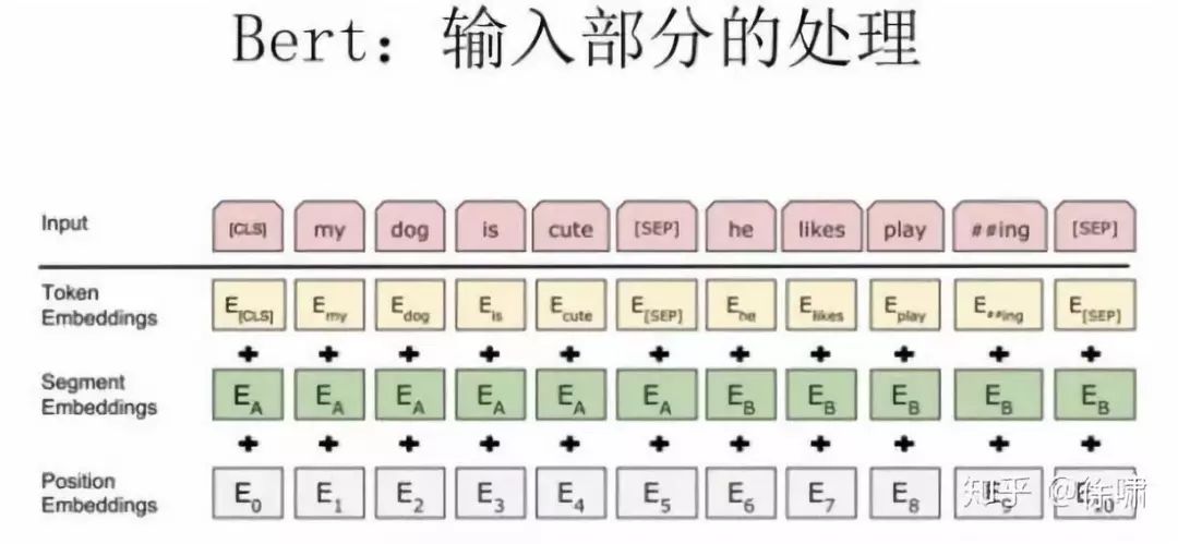 输入层:如果输入只有一个句子的话,则直接在句子的前后添加句子的起始标记位和句子的结束符号,在BERT中,起始标记都用“[CLS]”来表示,结束标记符用"[SEP]"表示,对于两个句子的输入情况,除了起始标记和结束标记之外,两个句子间通过"[SEP]"来进行区分。除了这些之外,BERT还用了两个表示当前是句子A还是句子B的向量来进行表示,对于句子A来说,每一词都会添加一个同样的表示当前句子为句子A的向量,相应的,如果有句子B的话,句子B中的每一个词也都会添加一个表示当前句子为句子B的向量。