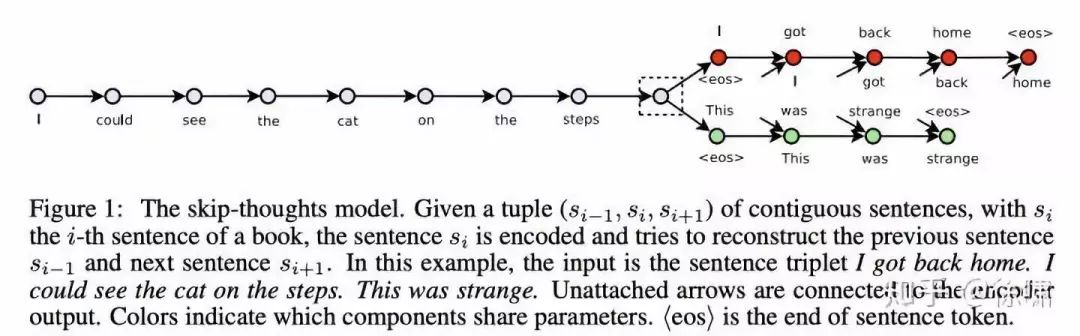 不过和普通框架不一样的是,Skip-thoughts有两个Decoder。在今天看来,这个框架还有很多不完善或者可以改进的地方(作者也在论文中分别提到了这些future works),比如输入的Encoder可以引入attention机制,从而让Decoder的输入不再只是依赖Encoder最后一个时刻的输出;Encoder和Decoder可以利用更深层的结构;Decoder也可以继续扩大,可以预测上下文中更多的句子;RNN也不是唯一的选择,诸如CNN以及2017年谷歌提出的Transformer的结构也可以利用进来,后来果不其然,谷歌的BERT便借鉴了这一思路。