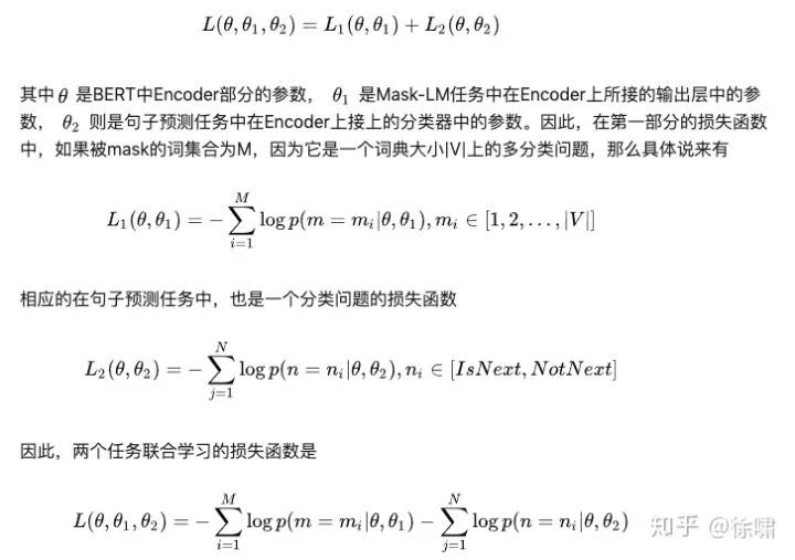 在预训练阶段,因为有两个任务需要训练:Mask-LM和Next Sentence Prediction,因此BERT的预训练过程实质上是一个Multi-task Learning,具体说来,BERT的损失函数由两部分组成,第一部分是来自于Mask-LM的单词级别的分类任务,另一部分是句子级别的分类任务,通过这两个任务的联合学习,可以使得BERT学习到的表征既有token级别的信息,同时也包含了句子级别的语义信息。具体的损失函数如下