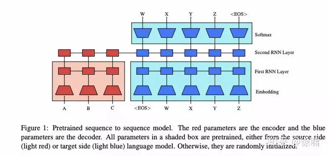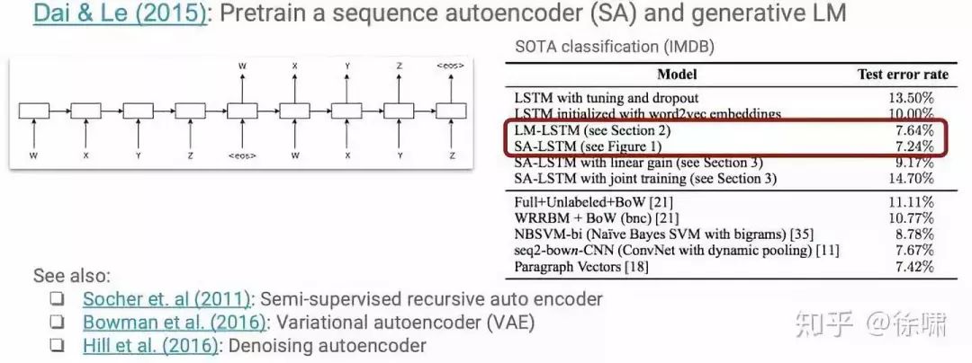 论文提出了两个方法,用无标签数据进行无监督训练的参数来初始化有监督学习的模型:一种是用基础的语言模型,另一种是用seq2seq自编码模型(sequence autoencoder, SA-LSTM),encoder 输入为WXYZ,decoder输出为依然为WXYZ。和普通的seq2seq模型相比不同的是,这里的encoder和decoder隐层是共享的。有种提前让循环神经网络学会句子的表达,再之后根据标签去学习分类的能力的思想。