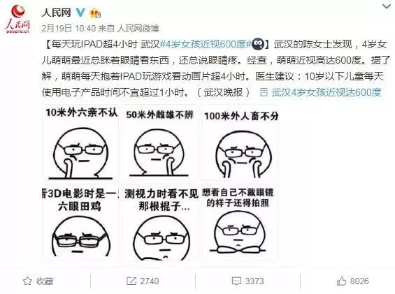 其实,这样的情况已经不是第一次发生了。早在二月份时,人民网就报道过这样的消息:因为每天玩IPAD超过4小时,武汉一4岁女孩近视600度。