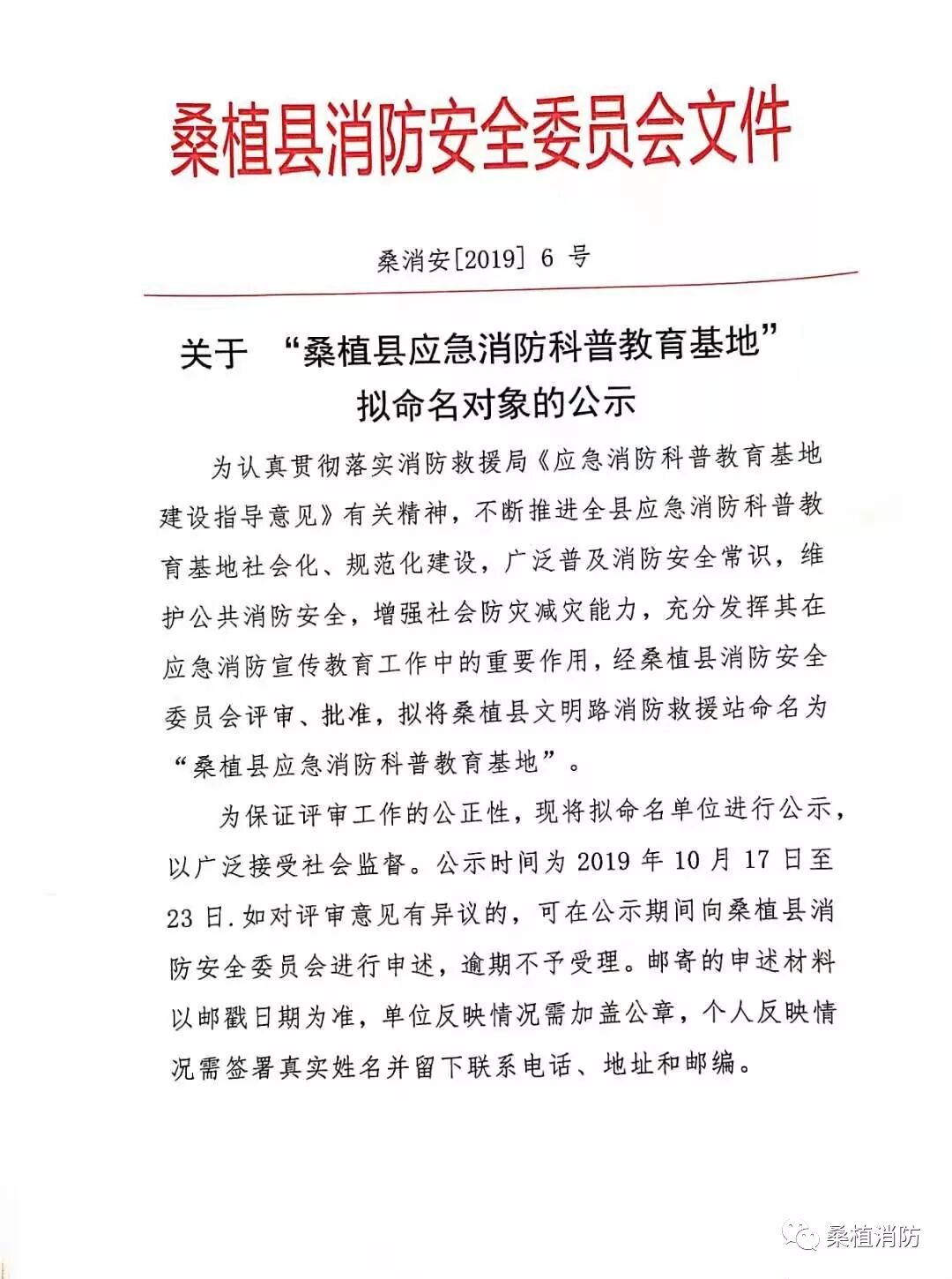 为普及消防安全常识,增强社会防灾减灾能力,提高广大群众消防安全意识,充分发挥其在应急消防宣传教育工作中的重要作用,经桑植县消防安全委员会评审、批准,拟将桑植县文明路消防救援站命名为“桑植县应急消防科普教育基地”。