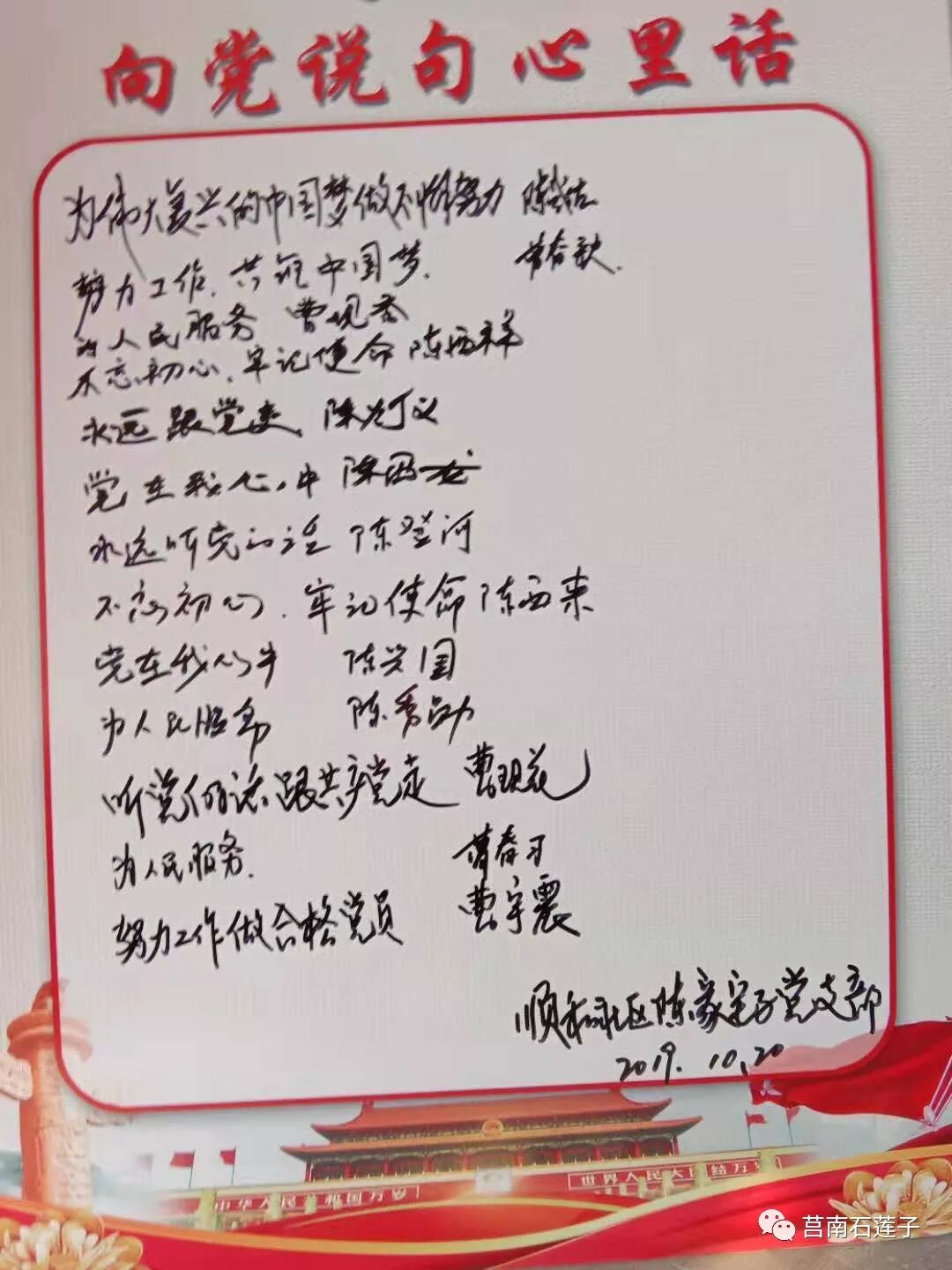 惠汝飞同志通过深刻认识中国共产党人的初心和使命、全面理解中国共产党人的初心和使命、自觉践行中国共产党人的初心和使命三个方面引用多家名言,摆事实讲道理,要求基层党组织和全体党员要充分发挥战斗堡垒作用和先锋模范作用,团结带领广大党员群众保持蓬勃向上、奋发有为的士气,保持攻坚克难、敢为人先的勇气,保持干事创业、争创一流的锐气,坚持“实干兴镇、廉洁奉公、自强不息、真心为民”的石莲子精神,争做初心和使命的践行者,为开创石莲子镇事业发展的新局面而不懈奋斗!