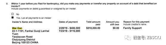 值得注意的是,破产文件显示,贾跃亭在提交破产申请前的一年之内,曾于今年2月28日和7月23日分别向甘薇转账40万美元和11万美元,总计51万美元,在用途一栏标注的是“家庭费用”。