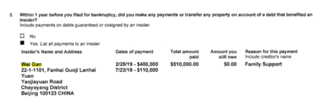 同时,文件截图还显示,在2019年2月28日,贾跃亭支付了甘薇40万美元的家庭抚养费,2019年7月23日,贾跃亭再度支付了11万美元。以此计算,贾跃亭在这五个月内的两次支付给甘薇的家庭费用,共计为51万美元。