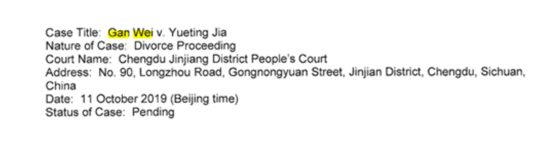 图片中的文件显示,2019年10月11日,贾跃亭和甘薇在四川成都锦江区人民法院申请离婚,目前状态是处理中。