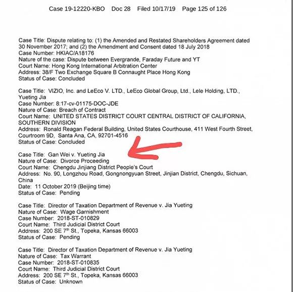 据界面新闻记者查阅,编号28的案卷显示,甘薇贾跃亭于2019年10月11日在四川成都锦江地区人民法院提出离婚。同时,贾跃亭在提出破产前的2019年2月28日和7月23日分别向甘薇支付40万美元和11万美元,作为家庭抚养费。