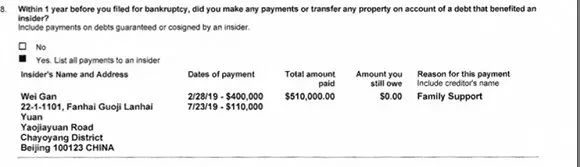 文件显示,贾跃亭在提出破产前的2月28日和7月23日分别向甘薇支付40万美元和11万美元,作为家庭抚养费。目前,该离婚案审理状态显示仍为处理中。