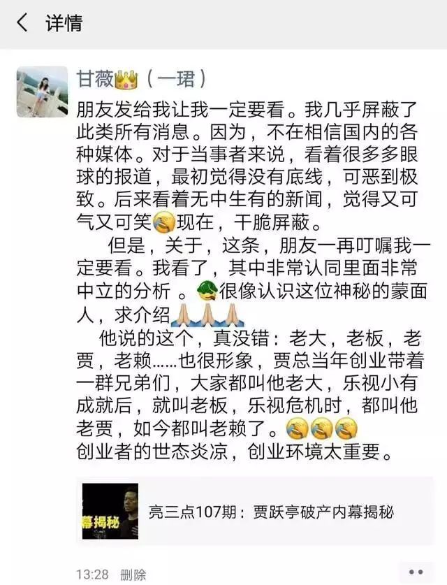 甘薇还感叹说“贾总当年带着一群兄弟们,大家都叫他老大,乐视小有成就后,就叫老板,乐视危机时,都叫他老贾,如今都叫老赖了。创业者的世态炎凉,创业环境太重要。”