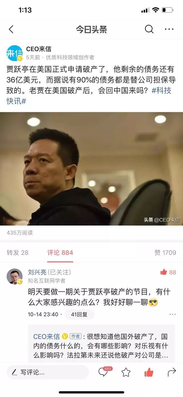 当时互联网学者刘兴亮还在我的微头条下面留言说第二天要做一个贾跃亭破产的节目,问大家有没有感兴趣的话题。CEO来信君也说了自己感兴趣的话题(见截图)。