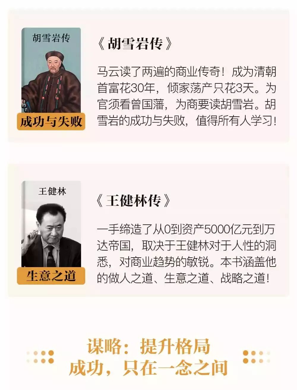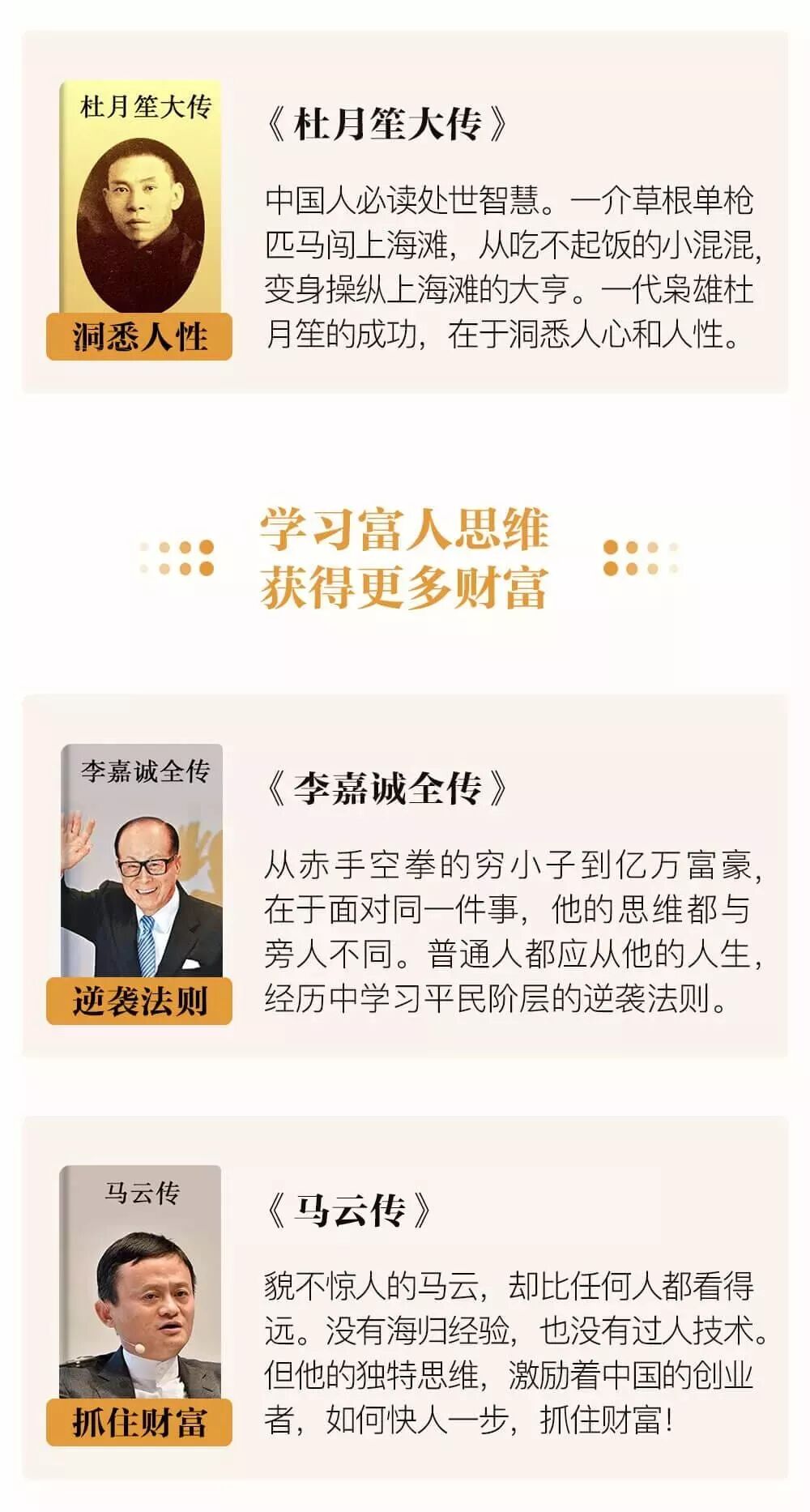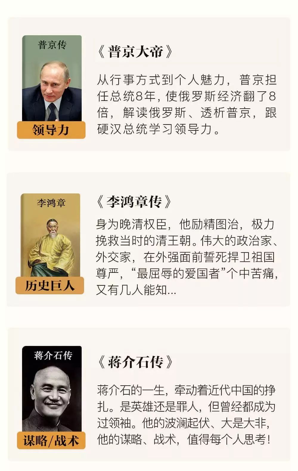 包括《曾国藩家书》、《杜月笙大传》、《马云传》、《蒋介石传》、《李嘉诚传》等10位大人物。
