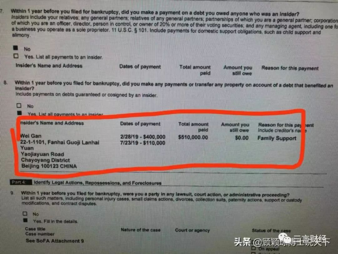 图片来源:破产文件截图 该份文件同时显示,贾跃亭在提交破产申请前的一年之内,曾于今年2月28日和7月23日分别向甘薇转账40万美元和11万美元,总计51万美元,在用途一栏标注的是“家庭费用”。