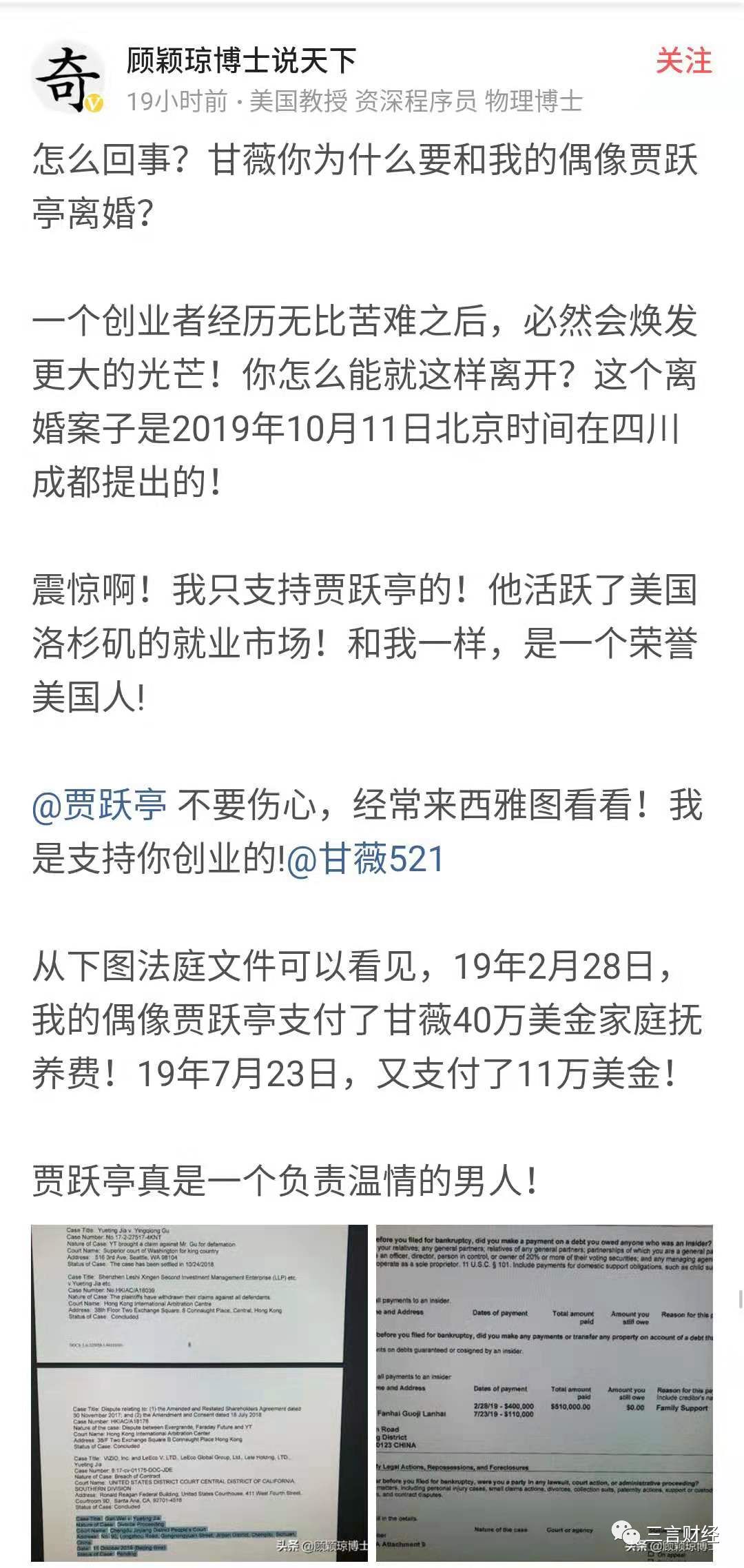 根据《三言财经》10月20日的报道,凌晨两点,与贾跃亭有诉讼历史的顾颖琼再次曝出大料——法庭文件显示,2019年10月11日贾跃亭和甘薇已经在成都锦江区人民法院申请离婚,状态是处理中。