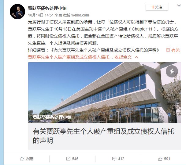 根据该方案,将同时设立债权人信托,并在条件满足的时候把全部在美国资产转让给债权人;该方案完成后,贾跃亭将不再持有任何法拉第未来的控股母公司Smart King股权(FF)。值得一提的是,在2017年贾跃亭远走美国时,承诺会对债务尽责到底,并成立债务小组专项处理,委托妻子甘薇、哥哥贾跃民在国内全权处理债务问题。10月14日,贾跃亭正式向美国特拉华州破产法院提交申请,寻求《美国破产法》第11章救济。债务人于申请日当天提交了预打包重组计划及相关披露声明。贾跃亭递交的破产申请文件,还列出了20大债权人名单,排列顺序为无担保债务额度大小。其中排名第一的是深圳英大资本管理有限公司,索赔理由为个人担保,索赔金额为2.797亿美元。那么,债权人对此又持何种态度呢?