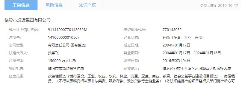 楼市资本论了解到临汾投资,全称是临汾市投资集团有限公司。工商信息显示其为国有独资企业,成立于2004年,注册资本为15亿元。经营业务范围主要包括政策性投资如城市建设、工业、农业、水利等,也就是民生基建类相关为主。其法定代表人为狄学飞,也是目前临汾市投资集团董事长。