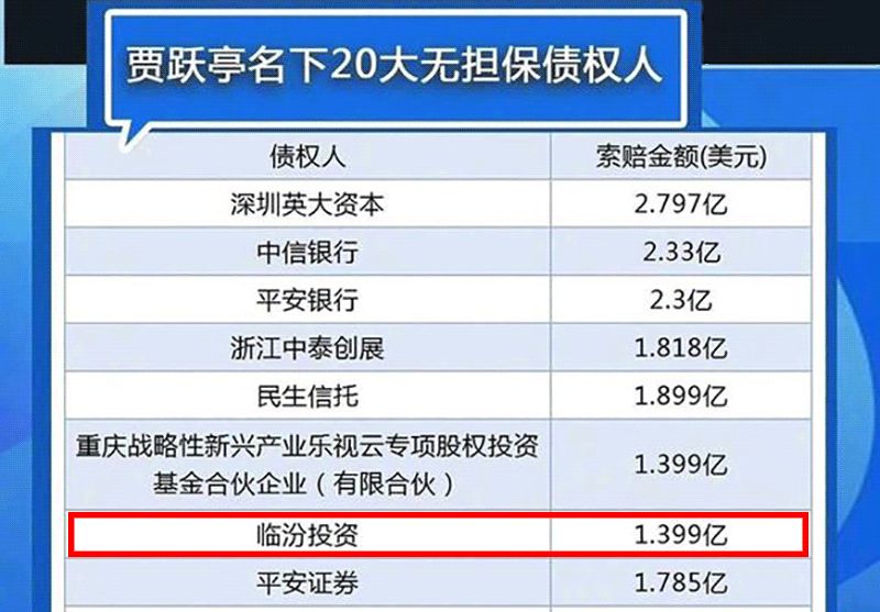 楼市资本论发现,贾跃亭的债权人也被曝光。按索赔金额,排名前列的有英大资本、中信银行、平安银行、中泰创展、民生信托、重庆战略基金、临汾投资、平安证券等,其中位列第七的临汾投资,索赔金额:1.399亿美元(据最新汇率合人民币约10亿元)尤为引人关注。据了解,这是一家来自贾跃亭家乡的企业,规模的债务已经相当于其老家襄汾县一年的财政收入了。