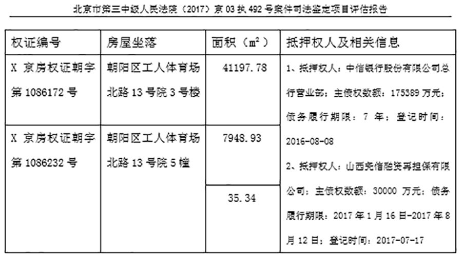 有媒体注意到,法院资产评估书显示,拍卖资产中的朝阳区工人体育场北路13号院5幢抵押权人为山西尧信融资再担保有限公司,主债权数额3亿元,债务履行期限为2017年1月16日——8月12日。