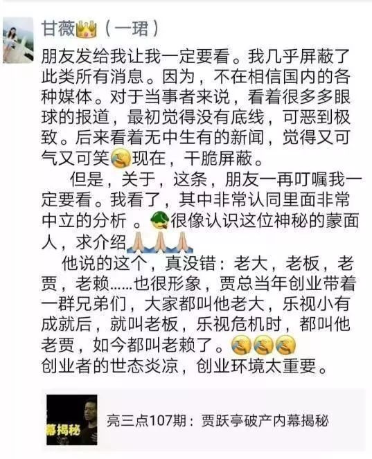 就在贾跃亭被曝申请破产后,甘薇也在她的朋友圈发文谈论这事。她表示她几乎屏蔽了此类消息,并且不再相信国内媒体,从老大、老板到老贾、老赖,她也感叹称呼的变化背后的世态炎凉。