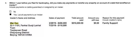 或许是看在孩子的面子上,在此次曝光的文件中,显示贾跃亭在破产前,分别于今年的2月和7月分两次向甘薇转账40万美元和11万美元,共计51万美元,用途是“家庭费用”。51万美元折合人民币大概是360万人民币,虽然金额不少,但相比于贾跃亭曾经拥有的财富显得不值一提。有人认为贾跃亭此举是想转移财产,也有人认为贾跃亭是要给甘薇和孩子留下了一些钱。