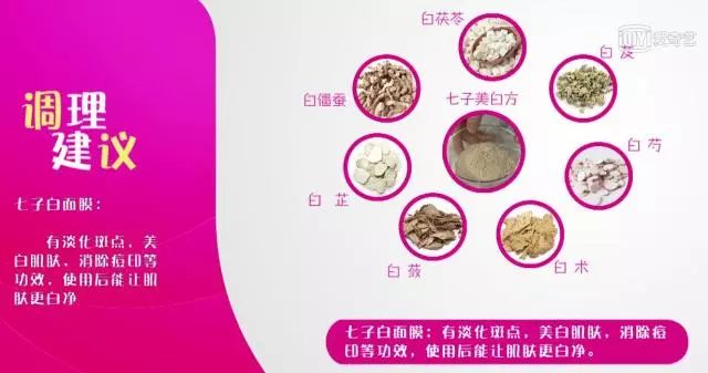 做法:把白茯苓、白僵蚕、白芷、白蔹、白术、白芍、白芨这几种中药材磨成粉(买磨好的七子白粉即可),然后等比例调和,如果皮肤过敏只用水调和,皮肤干燥的话加点儿蜂蜜,有痘痘就加鸡蛋清,如果皮肤不太润泽,那就加点儿鸡蛋黄。