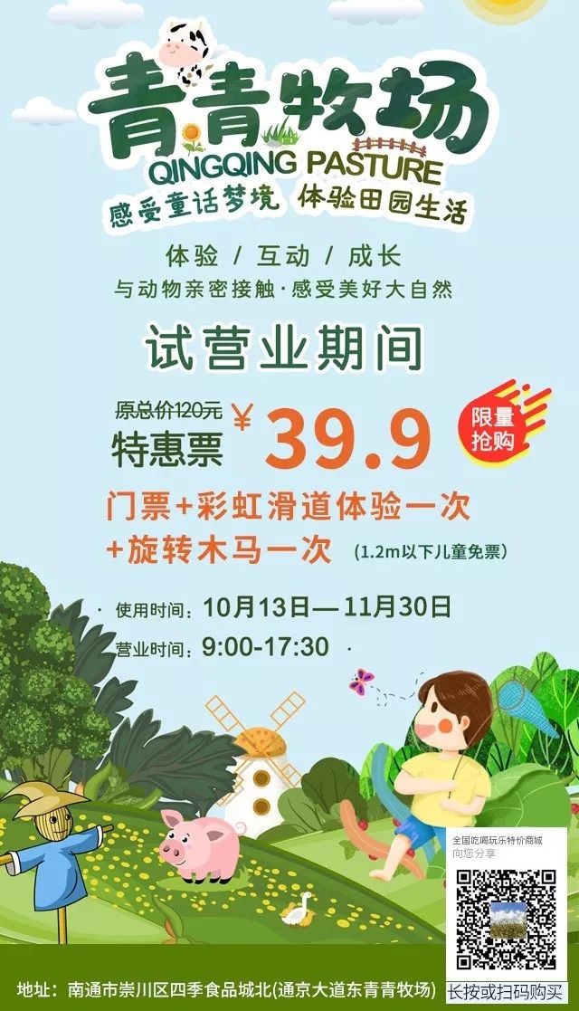 【使用时间】预售.29.9元:2019年10月13日—2019年10月28日,有效期内任选1天常规.39.9元:2019年10月13日—2019年11月30日,有效期内任选1天【营业时间】9:00-17:30【入园时间】9:00-16:30【入园方式】请凭预订短信验证码至景区检票口换票入园【使用人群】身高1.2m以上大小同价【费用包含】1、单人票+彩虹滑道体验一次,特惠29.9元2、单人票+彩虹滑道体验一次+旋转木马体验1次,特惠39.9元【费用不含】园内其它二次消费【免票政策】1.2m以下儿童免票,一个成人最多携带两名免票儿童入场【退改规则】不退不改【景区地址】南通市崇川区四季食品城北,通京大道东青青牧场青青牧场