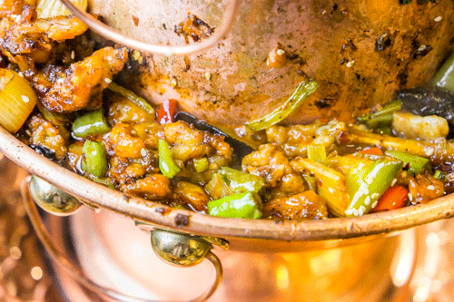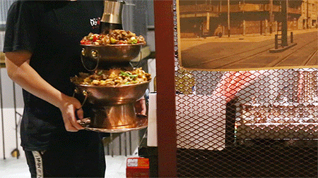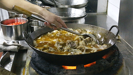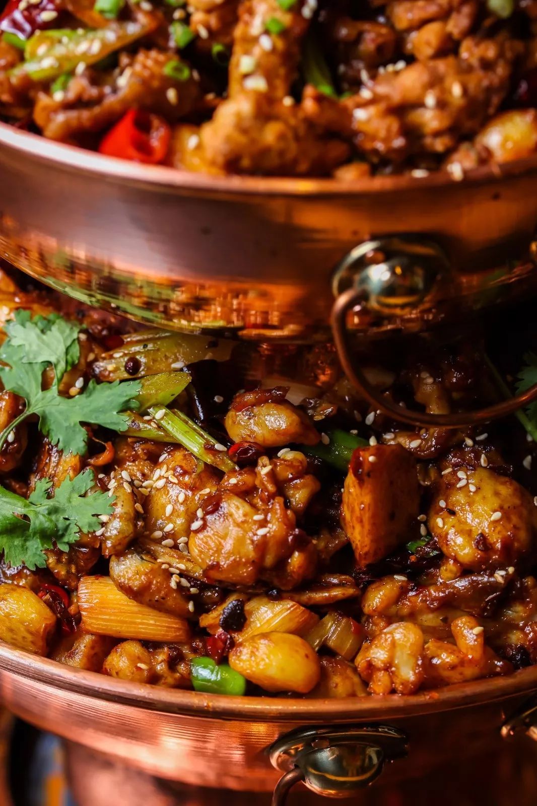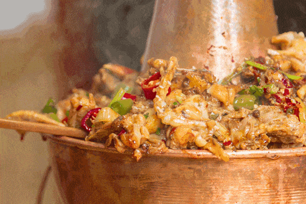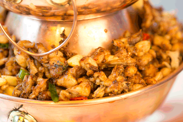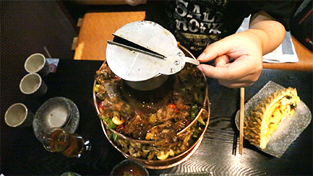 蛙肉特别嫩,上桌后只需等过2分钟左右就可以开吃了,这滋味刚刚好,如果喜欢焦焦的口感,可以让铜锅过烧一会。通过调节炭炉顶端的开合口,还可以自己调节火力大小哟~