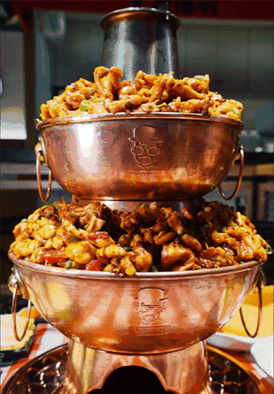 不管是第几次看到都会被震惊,足以喂饱大胃王,够3~4人分享的巨巨巨巨大的双层炭烧牛蛙锅,满满的都是肉,好巴适!