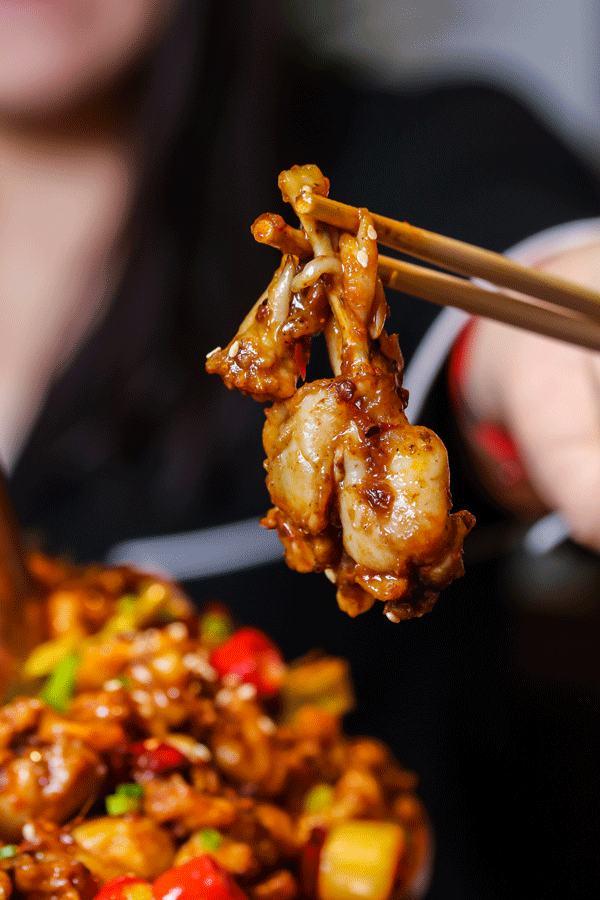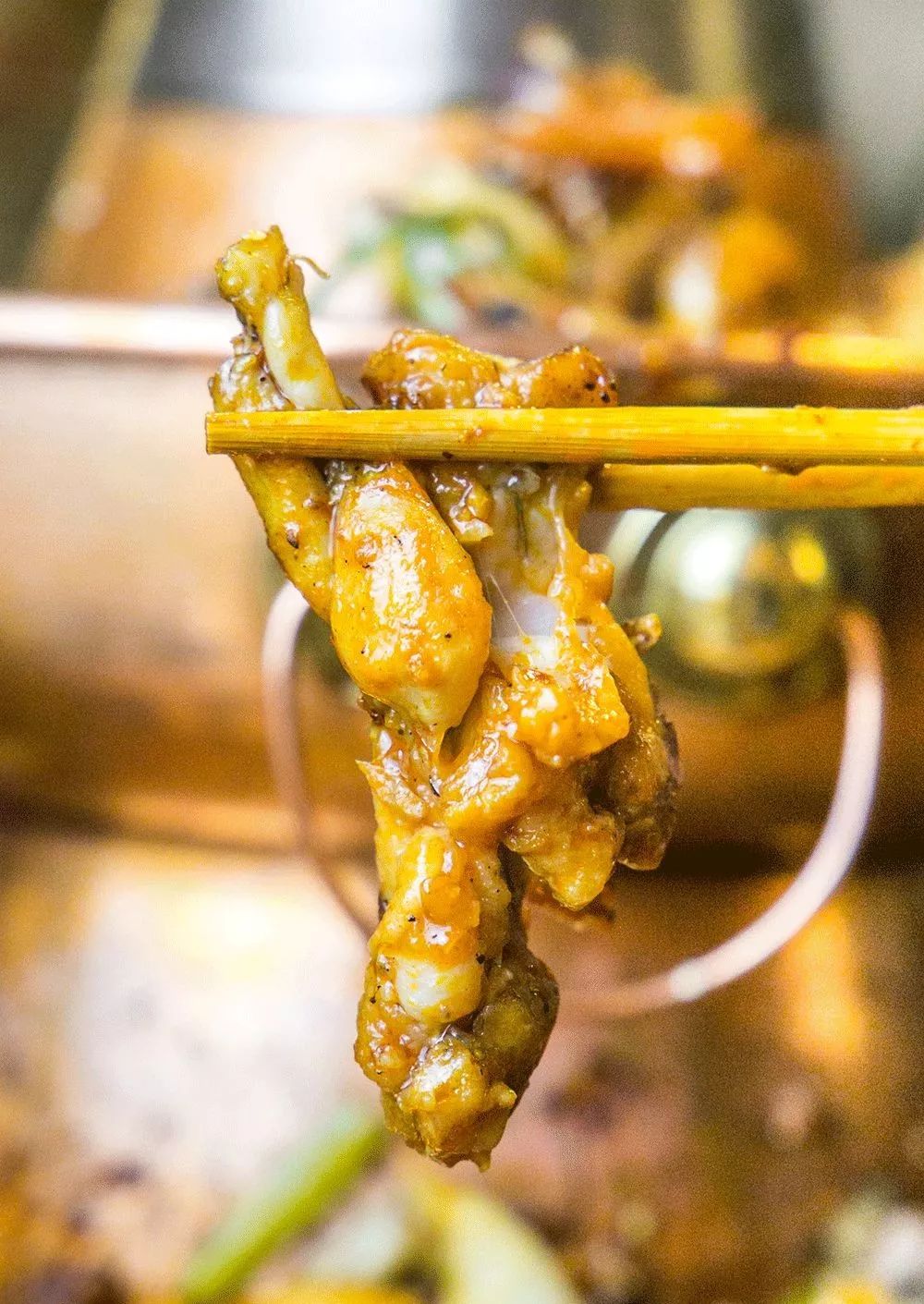 蛙肉越煮越入味,汤汁越收越浓,随便夹上一块,沾上锅底浓郁香辣的汤汁,辣却不会很浓烈,微麻的口感特别过瘾!