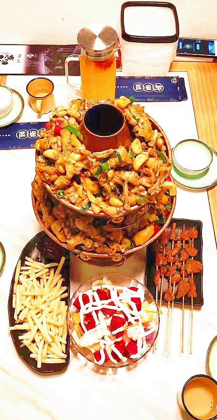 双层牛蛙锅+烤牛肉串+炸薯条...