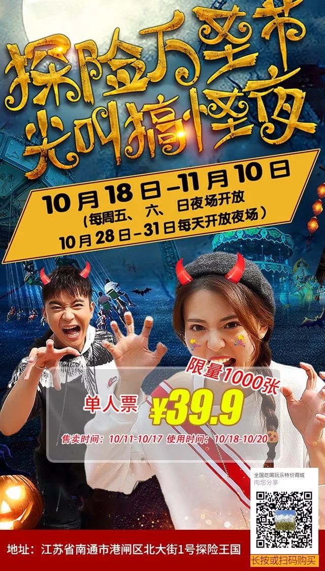 【使用时间】预售单人票:10月18日 - 10月20日;有效期内任选一天常规成人票:10月18日 - 10月31日(每周五周六周日、28-31号每天都开放)常规儿童票:10月18日 - 10月31日(每周五周六周日、28-31号每天都开放)【营业时间】16:00 - 21:30【入园时间】16:00 - 20:30【费用说明】1、夜场单人预售票1张2、夜场成人票1张2、夜场儿童票1张身高:儿童票适用于1.2米(含)-1.5米(不含)儿童【入园方式】请凭预订短信验证码至景区检票口往南30米网络取票处换票入园;【免票政策】1.2米(不含)以下儿童免费,70周岁(含)以上老人免票【退改规则】不可退改;【景区地址】南通市港闸区北大街1号南通探险王国【温馨提示】1、景区内游乐设备及自营项目一票畅玩 部分项目有身高、体重、年龄人数限制,符合要求方可体验2、如遇雷雨大风等天气影响或景区内设备常规检修,部分项目可能暂停开放,具体请以景区公告为准,不再另行通知,谢谢配合