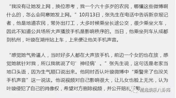 “这个是我的不对,她(叶璇)说得很对,因为每个公民都遵守公共秩序是很对的。当时我很生气,这一列车人都在看手机,另外在我前头第二排还有一个乘客,他放的声音一直放,放了几个小时,还比我声音大。我就说你‘神经病’吗,你这个人管的太宽了吧,火车上就是大家的(公共空间),你不说他们,为什么只说我呢。”