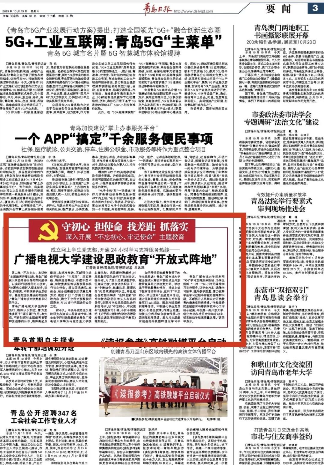 如何开好网络教育背景下的学生思政课?青岛广播电视大学在全国成人高校中首批成立开放教育直属网上学生党支部,学校基于开放教育的特点,将线上线下教育活动相结合,组织了“不忘初心、牢记使命”主题党日活动,通过互联网组织学生参与为中国海军打call活动、国庆为祖国献祝福等活动,不断强化学生党员意识、弘扬主旋律,传播正能量。学校充分利用综合楼宣传屏、校园阅报栏等渠道,着力为主题教育创造良好氛围和理论学习平台。