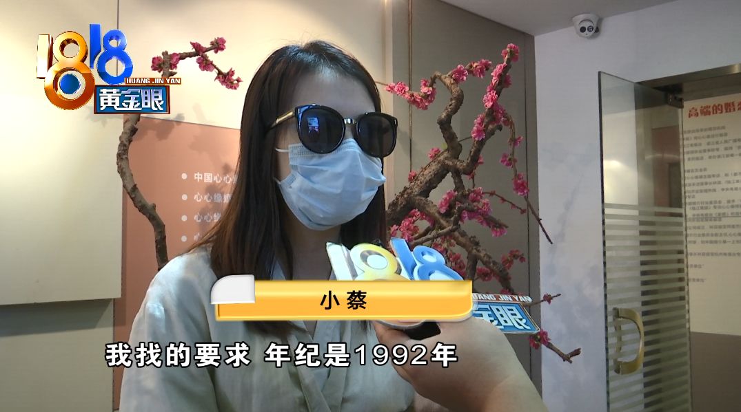 小蔡:“我找的要求,年纪是1992,1990年往上,1985年往下,大概那个年纪的男士,然后他们问我身高要求,我说168厘米以上,因为我身高是163厘米,然后体重要求,我说不是很胖就行,收入要求,我说五十万。(月薪?)年薪。哈哈哈。”