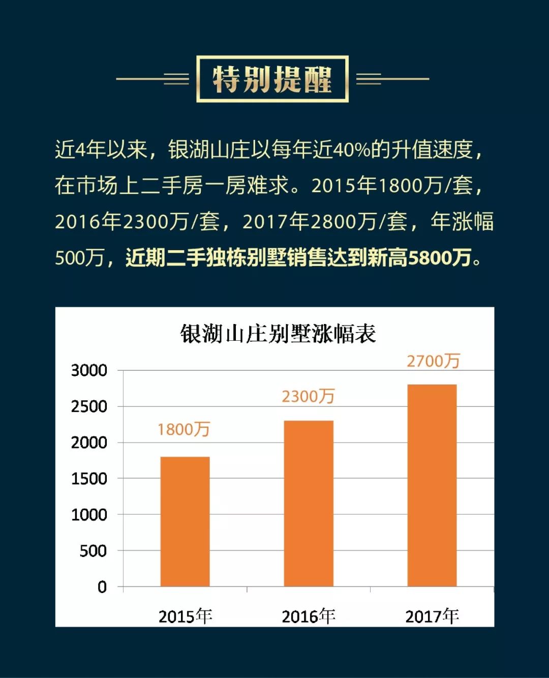 银湖山庄是10年来东莞增值最快的一个项目,没有之一。单价从最初的3千多,到现在近3万,每年以40%的涨幅增加,10年增值10倍。它的入住率更是达到了90%以上,甚至都没有二手房。