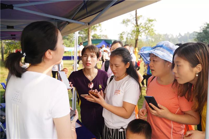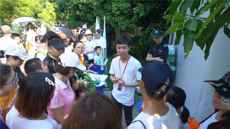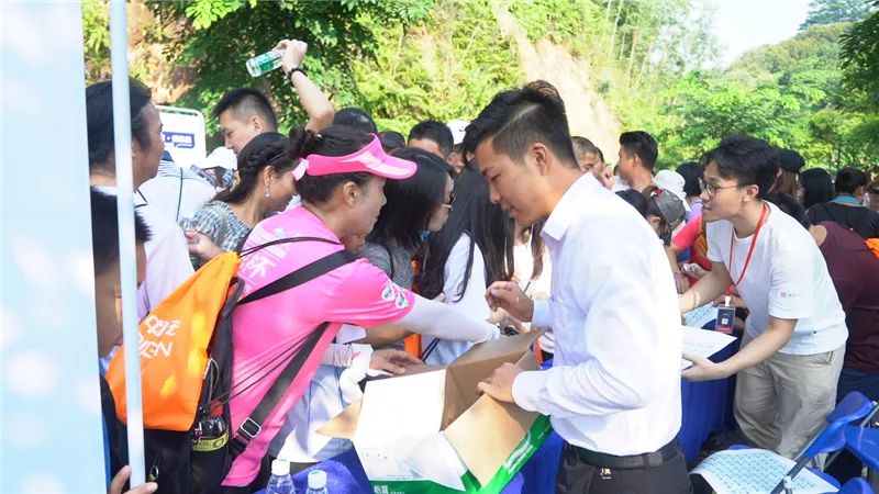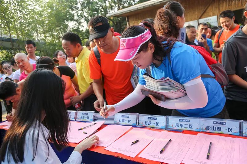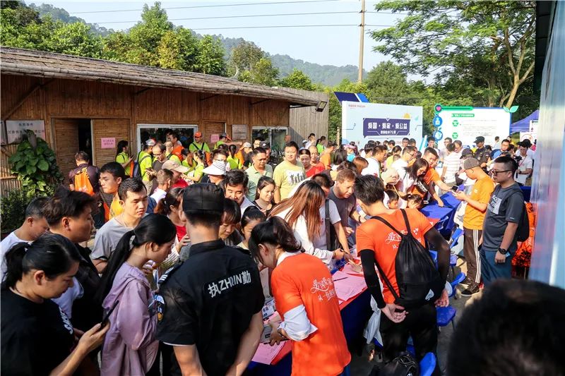 徒步者手拿入场券陆续到达了佛灵湖郊野公园,在签到处排队领取徒步能量包。