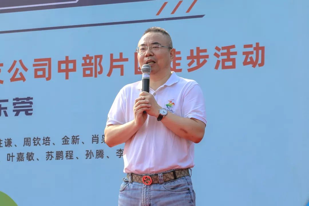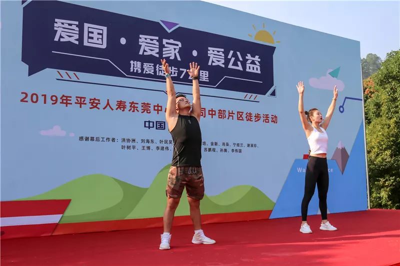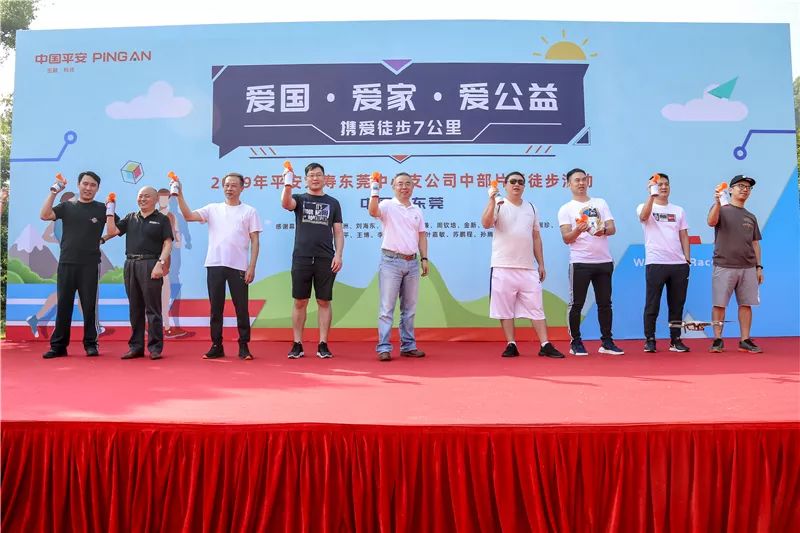 平安人寿东莞中心支公司总经理室严学斌总携同各营业区在场的业务总监们、领导们共同登台,来启动本次携爱徒步7公里活动。