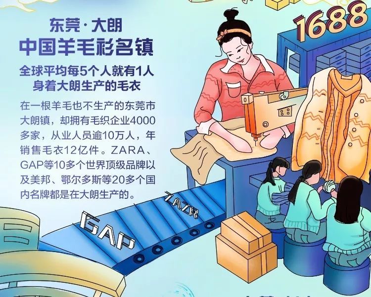 与虎门不同,东莞·大朗尤以羊毛衫这款单品蜚声海内外。这座中国羊毛衫名镇,拥有毛织企业4000多家,从业人员逾10万人,年销售毛衣12亿件。全球平均每5人就有1人身着大朗生产的毛衣。诸如ZARA、GAP等十余个世界顶级时装品牌,以及美邦、鄂尔多斯等20多个中国名牌的服装,都是在大朗生产。