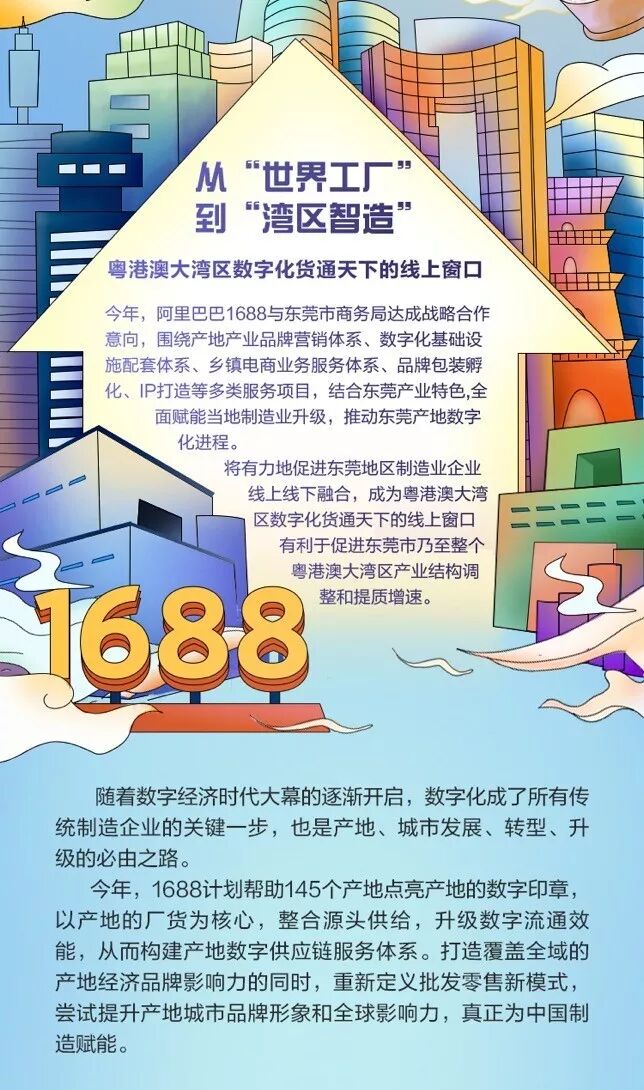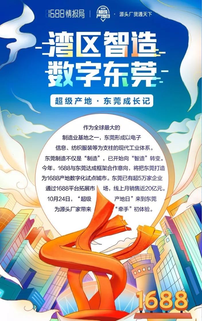 粤港澳大湾区建设正如火如荼展开,凭借强竞争力的产业集群优势,东莞正与香港合作开发建设东莞滨海湾地区,打造战略性新兴产业研发基地,以及与深圳协同,在珠江东岸打造具有全球影响力和竞争力的电子信息等世界级先进制造业产业集群。 携手1688探索产业带数字化,东莞超5万家企业尝鲜 对于东莞制造产业来说,即将过去的2019年,是从“制造”向“智造”转型的关键一年。今年,阿里巴巴1688与东莞达成框架合作意向,目标将东莞打造为1688产地数字化试点城市。 根据合作计划,10月24日,主题为“湾区智造数字东莞”的东莞&阿里巴巴 1688共建“产地数字化”战略发布会将在东莞文化中心召开。1688“超级产地日”也将登陆东莞,联手当地数万家源头厂家,共同为全球买家奉上一场年度促销狂欢盛宴。 数字经济时代,数字化升级是所有企业转型必由之路,1688的到来,也吸引了当地企业的热情参与。据统计,已有超5万家企业通过1688平台拓展市场,寻找商机,线上月销售额达近20亿元。 今年,1688计划帮助145个特色产业带点亮数字化印章。而为了推动东莞数字化转型,1688特别打磨了一套富有产业带特色的一体化服务体系——围绕产业带品牌营销体系、数字化基础设施配套体系、乡镇电商业务服务体系、品牌包装孵化、IP打造等多类服务项目,结合东莞产业特色,全面赋能当地制造业升级。 从制造业到“智造业”,1688正持续赋能东莞产地源头厂货,在帮助提升产地货源全球竞争力的同时,也尝试以产地数字化的方式,助力东莞的中国制造再上新台阶,从“世界工厂”向“湾区智造”转变,打造粤港澳大湾区数字化货通天下的线上窗口。