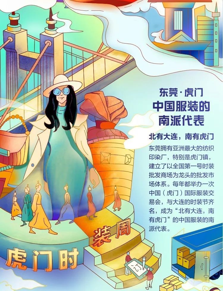 东莞过去只是珠江东岸一个普通的农业县,得益于改革开放,经过40年高速发展,迅速成长为“东莞塞车、全球缺货”的“世界工厂”,并构筑了以虎门、大朗、长安、常平等为代表的细分特色产地集群。 东莞服装产业发达,亚洲最大的纺织印染厂坐落于此。尤其是虎门镇,极富传奇地由一个渔村,蝶变成时尚之都,建立了以全国第一号时装批发商场为龙头的批发市场体系,获得了中国女装名镇、中国童装名镇、全国纺织模范产业集群、中国服装产业示范集群等多项国家和省级荣誉称号。一年一度的中国(虎门)国际服装交易会,与大连的时装节齐名,被行业冠以“北有大连、南有虎门”的中国服装的南派代表。