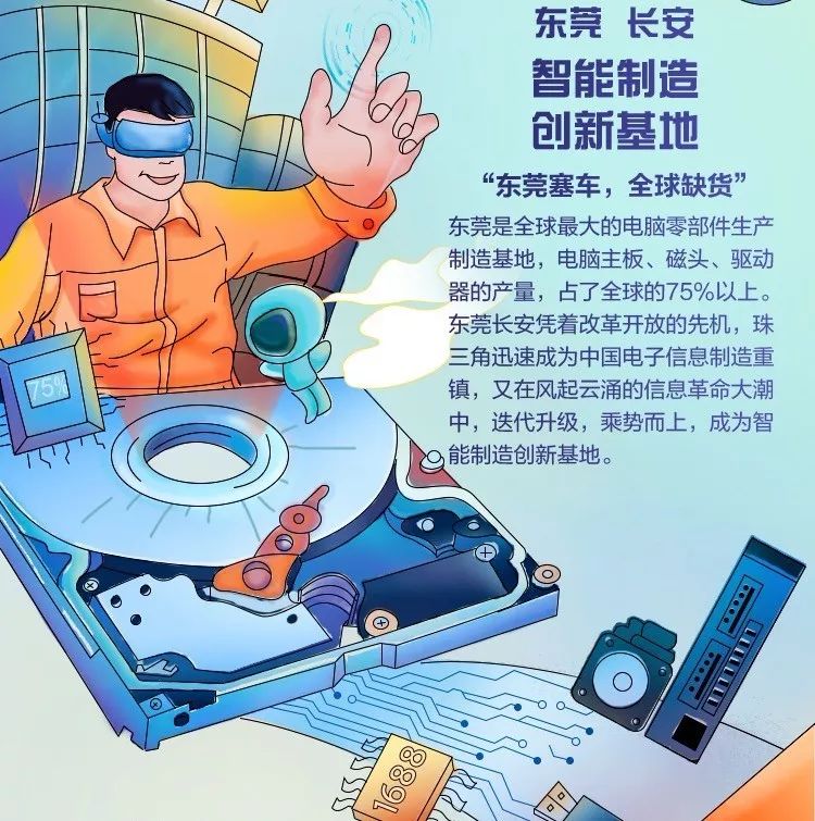 有着全球最大的电脑零部件生产制造基地,独享全球75%以上电脑主板、磁头、驱动器产量的东莞,自然而然地也成为中国制造业转型升级的排头兵。东莞·长安凭借敏锐的嗅觉,乘着改革开放春风,在珠三角这块活力的土地上迅速崛起,成为今日的“中国电子信息制造重镇”。也在智能制造浪潮下,果断进行产业迭代升级,打造出国内颇具代表性的智能制造创新基地。