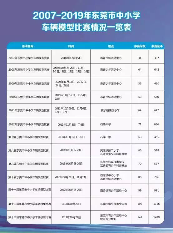 为引导广大青少年开展健康有益的课外活动,帮助他们学习科学文化知识,培养动手操作能力,树立远大理想,推动我市中小学生车辆模型教育活动的开展,根据东莞市全民科学素质工作领导小组办公室《2018年东莞市全民科学素质工作要点》文件精神及市教育局2019年8月9日印发的《关于组织2019-2020学年东莞市中小学科技模型系列活动的通知》要求,东莞市决定10月23日(星期三)举办东莞青少年庆祝新中国成立七十周年系列活动之“驾驭未来”第十三届东莞市中小学车辆模型比赛。1