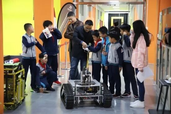 小朋友们参观演示ROBOMASTER比赛中上场的机器人专区