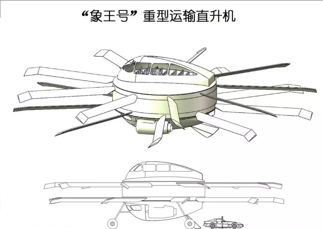 其实,大嘴鹦鹉航天技术实验室,还搞了一个“象王”号重型运输直升机,也是一种造型独特的新概念直升机,除了多了一对桨叶,布局上与“超级大白鲨”倒是有异曲同工之处。
